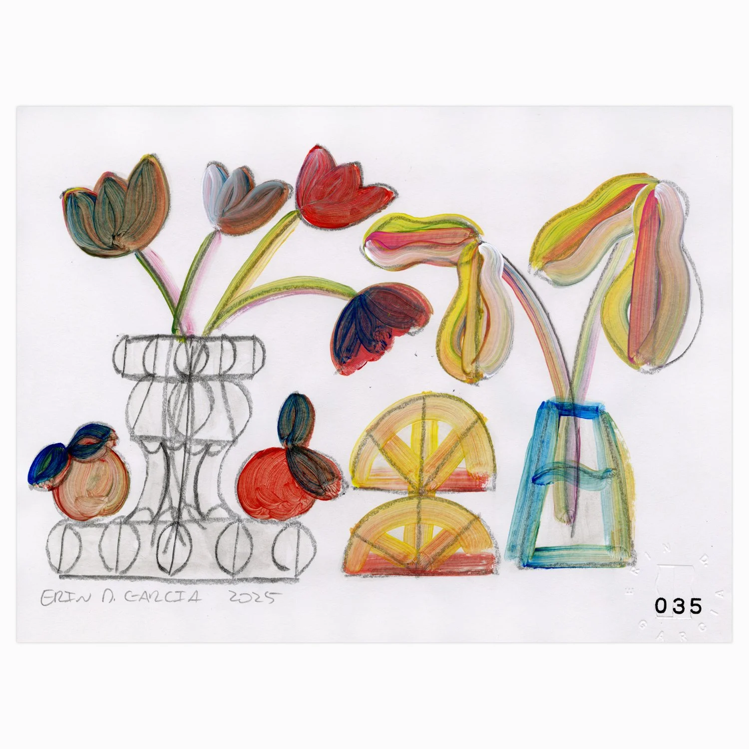 Taken together, this group of 180 drawings and paintings, produced between 2012 and 2025, reads less as a survey than as an ongoing archive. The recurring subjects of plants, flowers, figures, fruit, birds, gradients, and elemental forms are presented without narrative or context, returning again and again as sites of inquiry. Their repetition suggests less a search for resolution than a commitment to staying with a form long enough for its complexity to unfold.