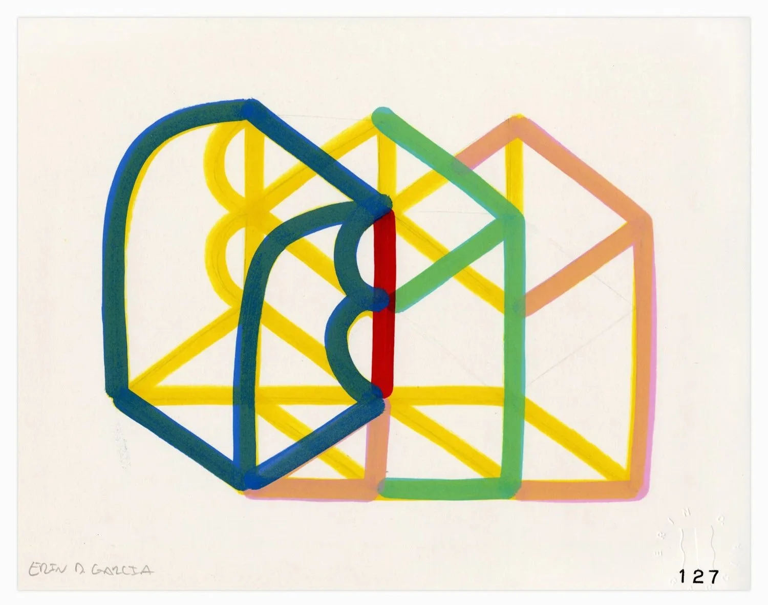 The work develops through gradual accumulation. Minor adjustments in color, scale, and line register as meaningful events, and familiar motifs shift subtly over time. These pieces serve as a space for testing and refinement, generating the visual language that later expands into murals and larger canvas works. What emerges is a practice rooted in continuity and restraint, allowing the work to shift slowly, and reveal patterns and possibilities over time.